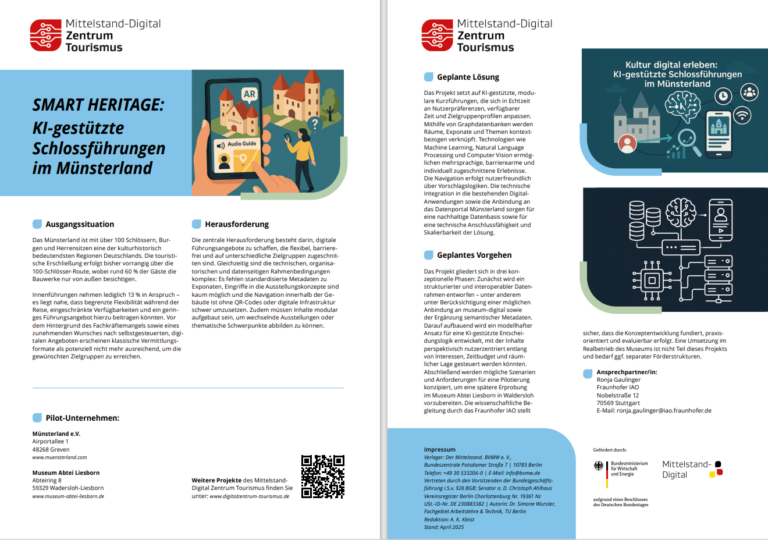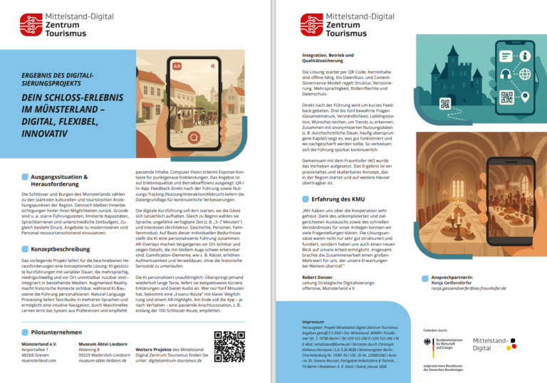 Das Mittelstand-Digital Zentrum Tourismus veröffentlicht regelmäßig kompakte Informationen zu seinen laufenden Digitalisierungsprojekten mit Unternehmen. In diesem praktischen, downloadbaren OnePager-Format erfahren Sie, wie im Münsterland ein digitales Führungsangebot mit Künstlicher Intelligenz entwickelt wird.