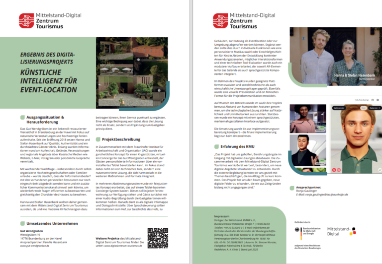 Wie kann ein kleines Unternehmen digital unterstützt werden? Die Veranstaltungslocation Gut Wendgräben setzt auf Künstliche Intelligenz: Kann ein virtueller Concierge auf Tablet-Basis Gäste individuell über Hof, Veranstaltungen und Umgebung informieren? Alle Projektergebnisse finden Sie kompakt in unserem neuen OnePager zum Download.