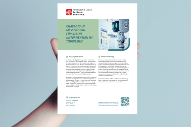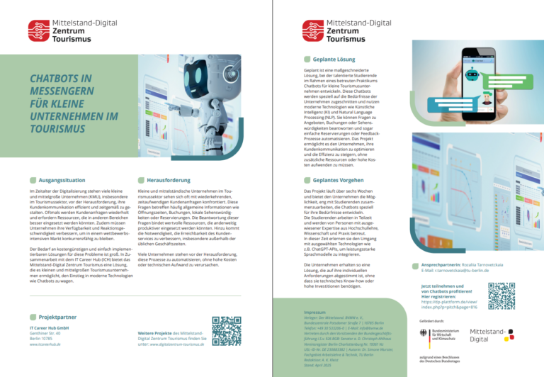 Nutzen Sie jetzt die Gelegenheit: Kleine und mittlere Tourismusunternehmen können sich noch bis Ende 2025 kostenlos für die Teilnahme am Projekt bewerben. Bringen Sie gemeinsam mit den IT-Talenten des IT Career Hub eine smarte Chatbot-Lösung in Ihr Unternehmen.