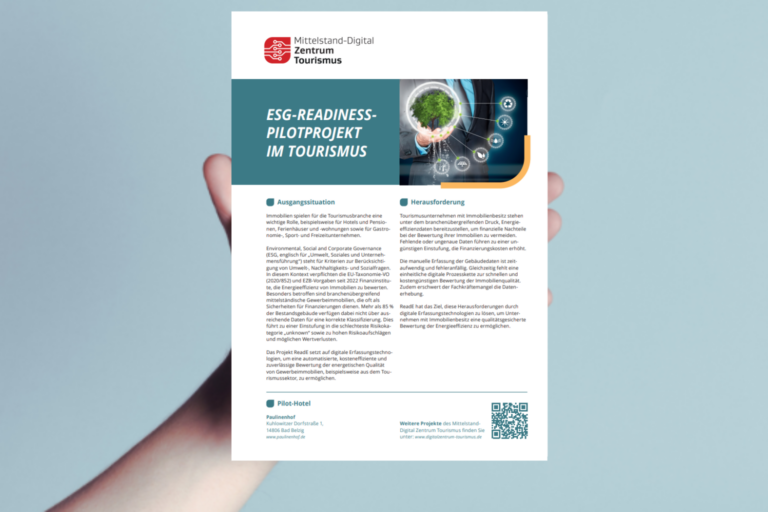 Mit dem Pilotprojekt readE zeigt das Mittelstand-Digital Zentrum Tourismus in Zusammenarbeit mit dem MDZ Bau und MDZ Handel, wie Unternehmen konkret auf neue regulatorische Anforderungen – wie die EU-Taxonomieverordnung – reagieren können.